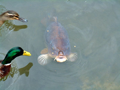 Карп легко может вспугнуть уток, иногда вы видите их взлетающими и затем садящимися на воду с громкими криками - что-то под водой напугало их. Также вы можете увидеть мирно плывущих уток, которые вдруг останавливаются, как вкопанные, и начинают внимательно вглядываться в воду, медленно отплывая назад. Велика вероятность что там либо карп, либо щука.