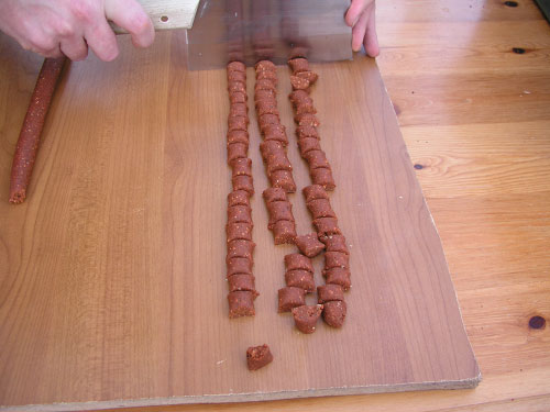 морозильник, для придания ему твердости, что облегчает нарезку. После этого я