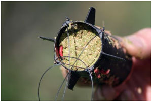 Сыпучие прикормки, такие как пеллетс, опарыш и мелкие бойлы или зерновые, будут высыпаться в полете если не принять меры против этого. Для предотвращения такой ситуации используйте "пробку" из тестообразных прикормок или несколько больших кусков растворимых ПВА пенок.