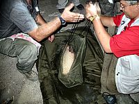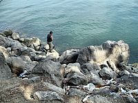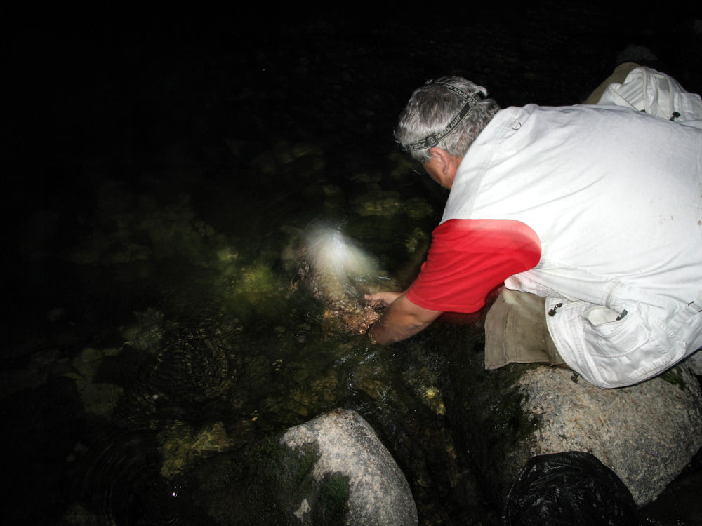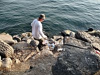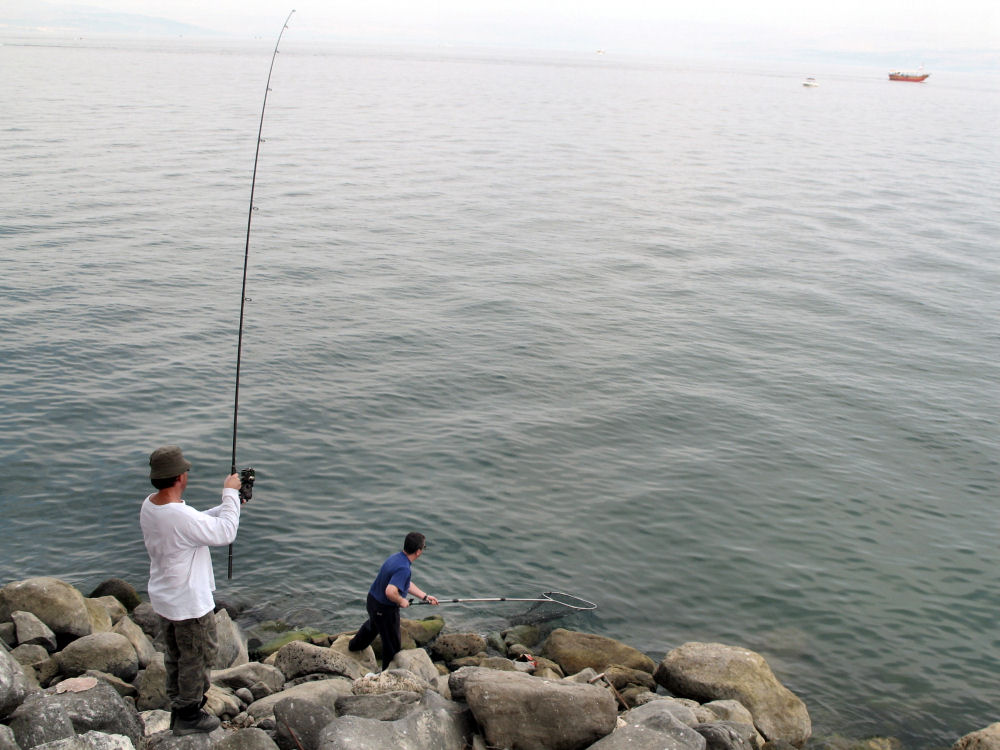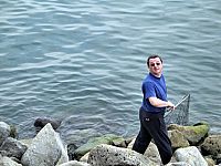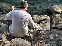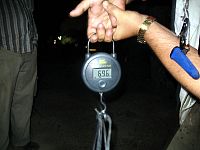 Без двадцати минут час у Эдика мощный паровоз. Все сразу забегали. Я взял подсак и поскакал к воде. Оказалось, что а) рыба перехлестнулась с другой леской и находилась от меня вне пределов досягаемости (нужно было обойти огромный валун); б) подсак Эдика, который я взял, был явно маловат для той рыбы, которая приближалась!