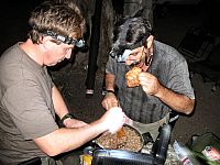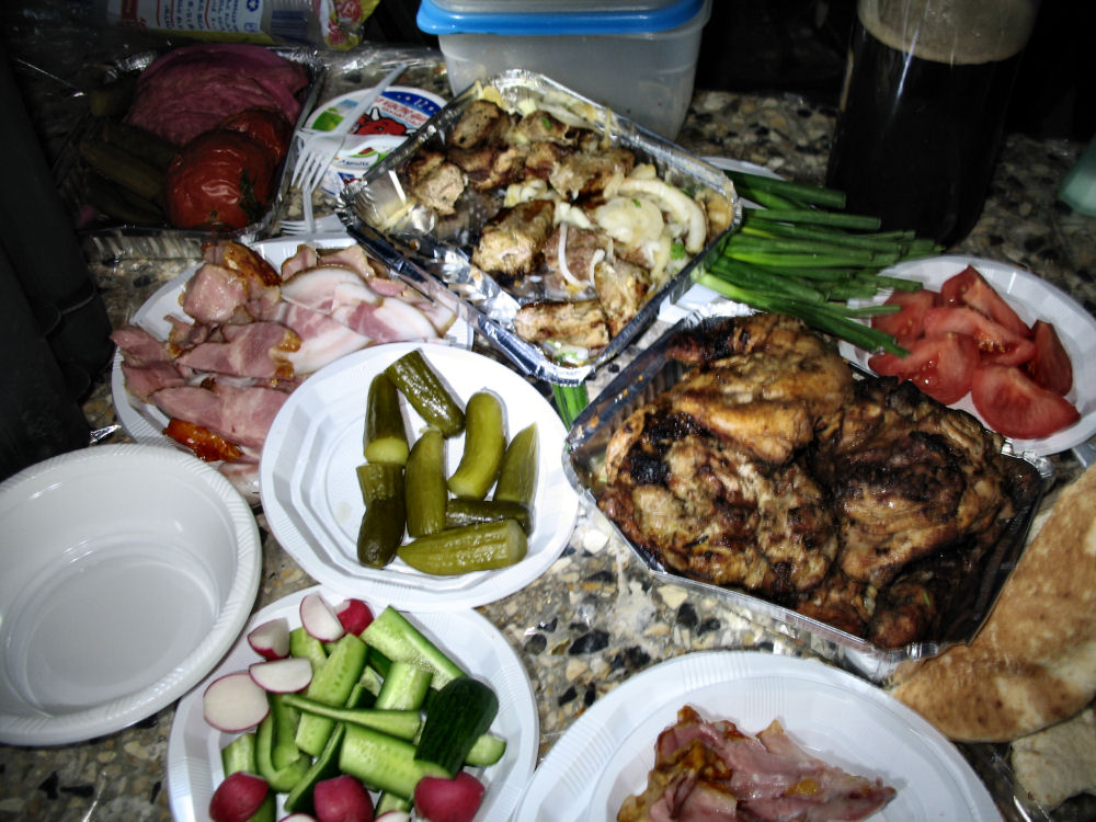 Начали накрывать на стол. Доктор с Борей начали разогревать гречневую кашу с тушенкой. И тут на запах из темноты появился Эрик. Но не с пустыми руками! Он привез в лотках серьезное количество разной снеди прямо из ресторана, где праздновал день рождения жены (фото 4)!